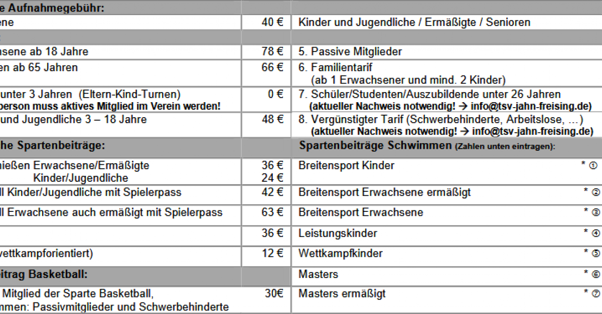 Angegeben werden hier die Mitgliedsbeiträge pro Halbjahr. Der Beitrag wird jeweils im Januar und im Juli für sechs Monate im Voraus abgebucht. Zu Beginn der Mitgliedschaft anteilig zum laufenden Halbjahr!
